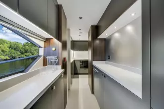 Two fully equipped crew heads provide convenience and privacy, each finished with durable, easy-to-clean materials and modern fixtures to maintain a high standard of comfort. The crew area includes a dedicated lounge and workstation, allowing your team to relax and manage the yacht’s operations efficiently.