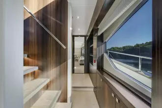 At the heart of the yacht is the main deck master stateroom, a standout feature typically found only on much larger yachts. This full-beam suite benefits from expansive panoramic windows, flooding the space with natural light and offering uninterrupted views from the comfort of your king-size berth. A beautifully appointed en-suite head with a large walk-in shower, premium stone countertops, and elegant detailing completes the master experience.
