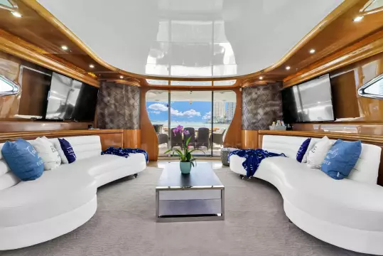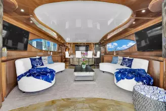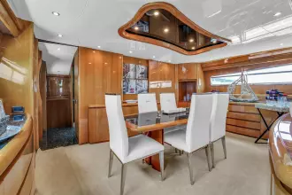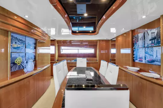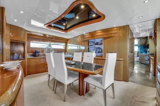 The salon has electrically operated glass door from the aft deck and features two curved symmetrically styled large plush sofas. There is a curved bar amidships forward, with marble surface. The wet bar has Icemaker, stainless steel circular sink and ample storage. Behind and above the bar is a 42' Samsung Plasma TV. The entertainment system is comprised of a DVD and CD players, satellite TV receiver and complete BOSE surround system. Proceeding forward from the salon there are two electric glass doors. The starboard door leads to the main foyer with the day head and the staircase to the cabins and side exit door while the port door leads to the formal dining room.