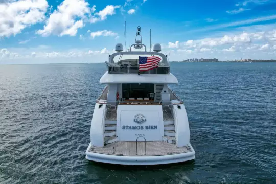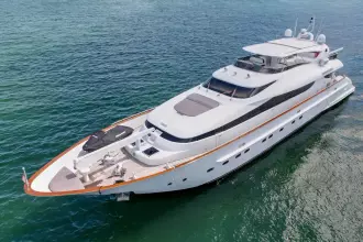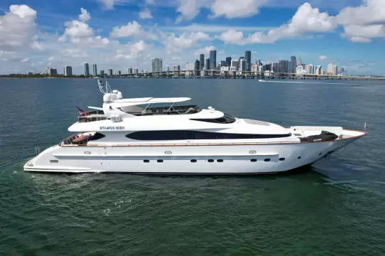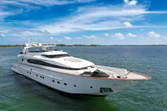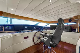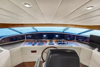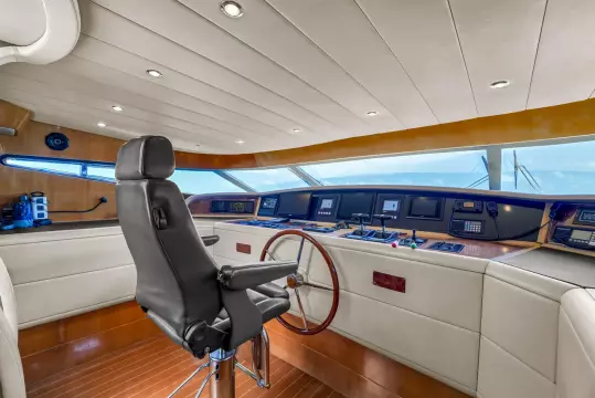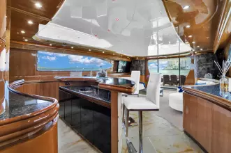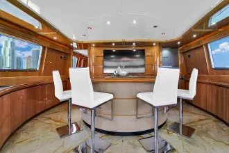 Wet bar in salon with ice maker; extra freezer and refrigerator below raised pilot house; (2) washers and dryers; Gaggenau barbeque, refrigerator, sink, and ice maker on flying bridge; central vacuum system. Furniture and all bulkheads in lacquered wood, gloss or satin. Floors and tops of galley and bathrooms are covered with marble or granite as well as the tops of the bars and some floor sections particularly subject to traffic.