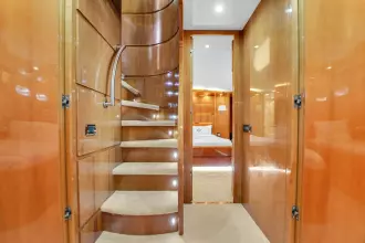 The Crew Quarters have three separate rooms and a Captain's cabin with ensuite bathroom, single bed, closet, dresser, safe, night table and reading lamp; a crew cabin with two beds, closet, drawers and reading lamps and a third cabin with a double bed. The latter two share a large bathroom with cabinet, mirror, washbasin, toilet, electrical exhaust fan, and a stall shower. All three cabins have their own flat screen TV with satellite receiver and a radio/CD player. Finish is the same as the rest of the yacht. Miele washer dryer