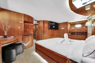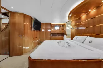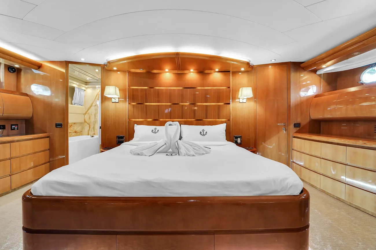 The Master Stateroom is located amidships with king size bed, two night stands, a chest of drawers, writing desk and vanity, safe, spring mattress with pillows, bedspread, halogen ceiling lighting, accent lighting (at sides and at the base of the bed), 55” Samsung flatscreen TV with satellite receiver, multi-system VHS, radio/stereo with CD player. Accessible from the cabin is a walk-in closet with wardrobe, drawers and shelving. The fully marbled bathroom has a Jacuzzi bath, two ceramic washbasins, toilet, cabinets, mirror, electrical exhaust fan, accessories and stall shower.