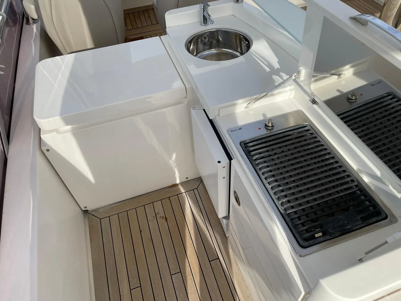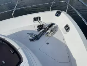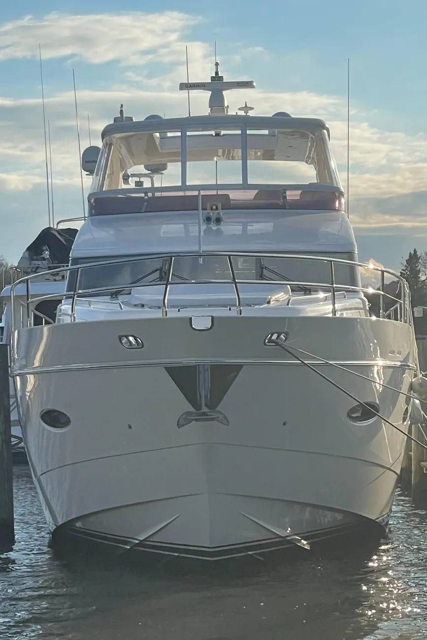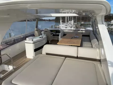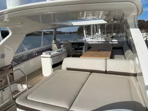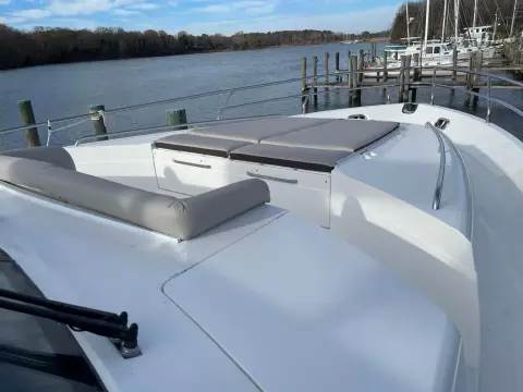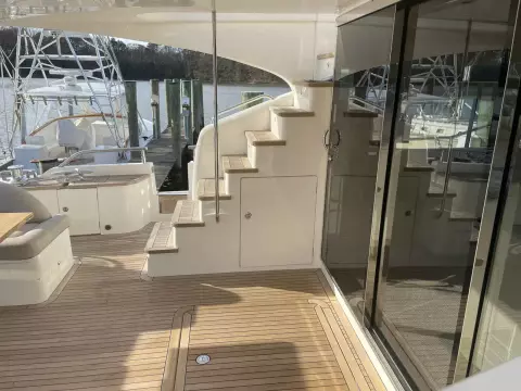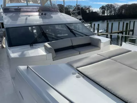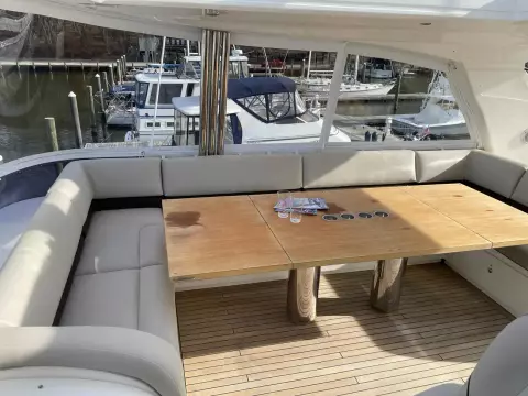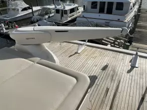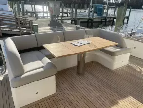 The outside of the yacht features spacious side decks, forward seating area, sun pad, hand railings with bulwarks, and teak decks. The fly bridge has the upper helm, large U shape seating area with table, wet bar, hardtop with new electric retractable soft sunroof, Opacmare davit with inflatable and 4 stroke Yamaha and much more.