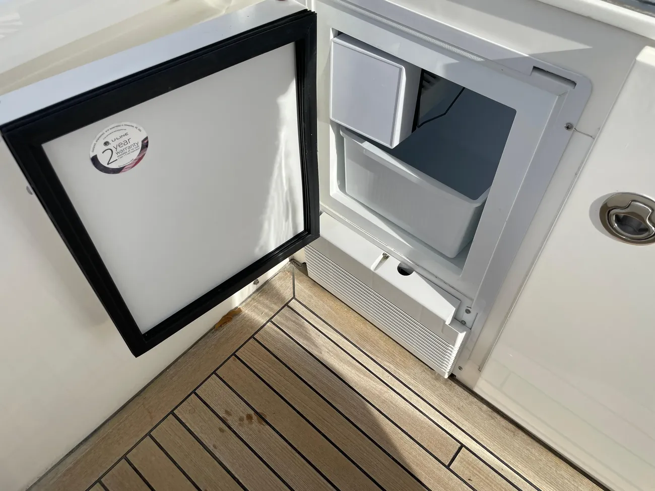 A large Stainless Steel sliding door enters into the salon, which also opens to the aft deck. The salon is open with views straight thru to the windshield. The side panoramic windows provide a continuous supply of natural lighting.