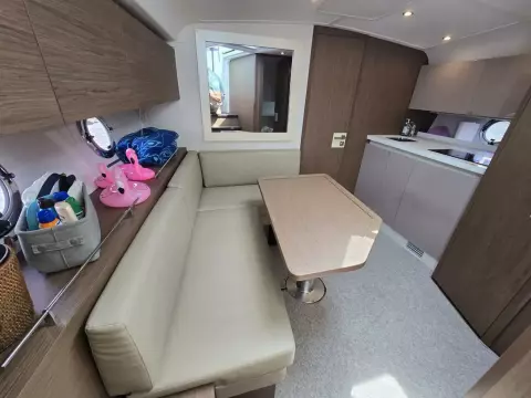 - Natural solid wood cockpit table (0,95 m x 0,6 - 1,2 m / 3’1’’ x 2’ - 3’11’’) convertible into sun lounger (1,90 m x 1,65 m / 6’3’’ x 5’5’’)