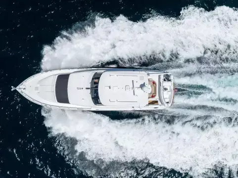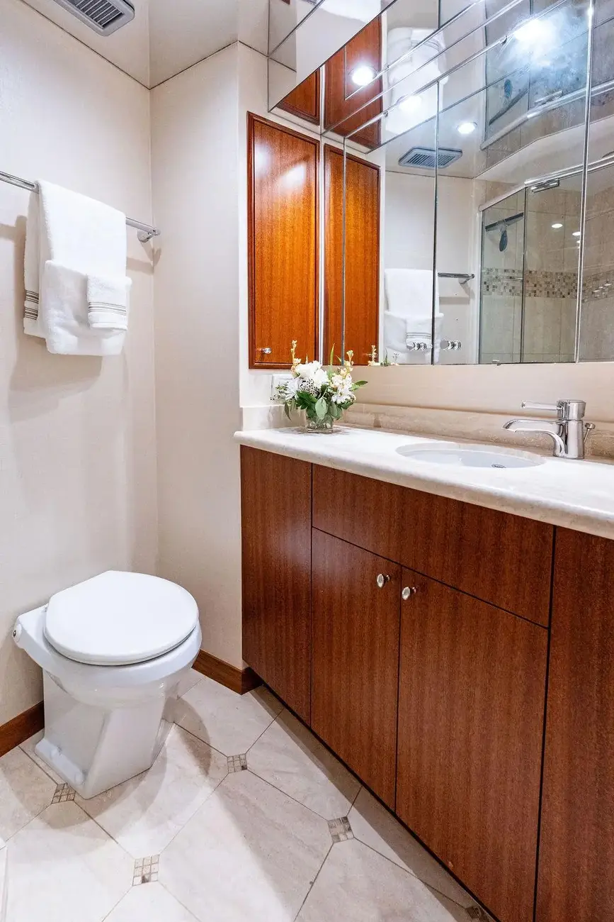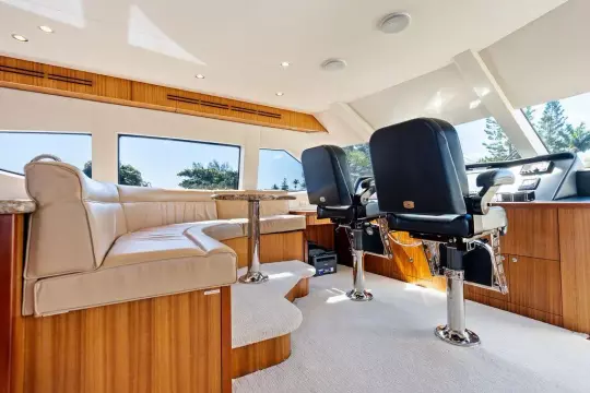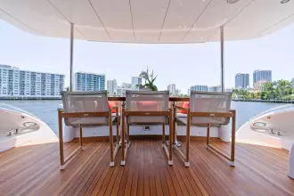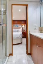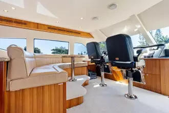 On her main deck she offers an aft area for alfresco dining, a wide body salon with ample area for entertaining or relaxing and a large, well equipped galley. The expansive, enclosed flybridge is open to the helm area and offers an air-conditioned luxurious second salon for relaxing or entertaining with panoramic views of the water. Aft of the enclosed bridge is an outdoor seating area and electric grill, with the tender and hydraulic davit. Below deck offers a full beam master, a spacious VIP forward, a full size guest stateroom to port and a twin guest stateroom to starboard. All staterooms are en suite. The spacious engine room and crew quarters are aft of the staterooms.