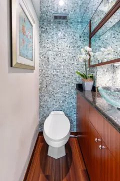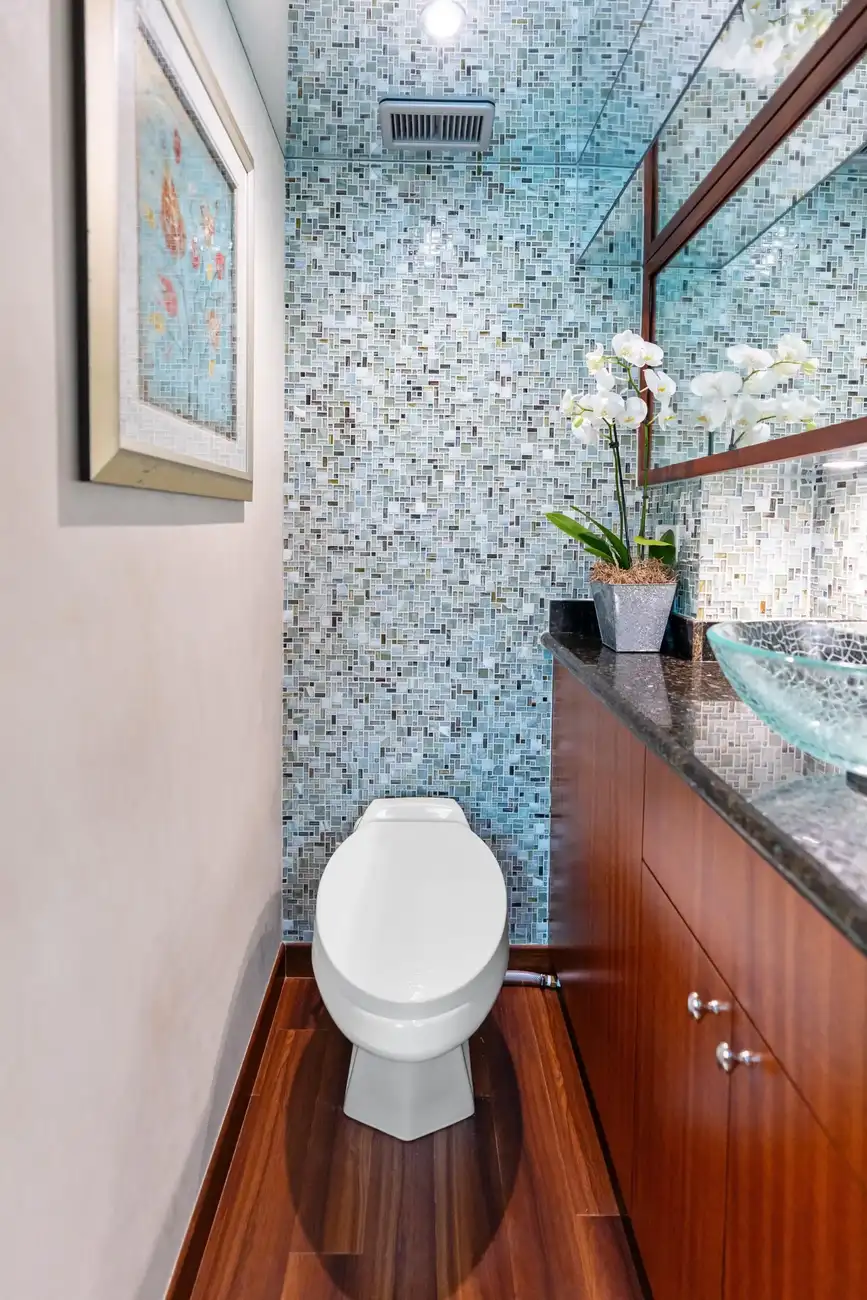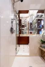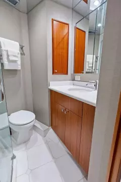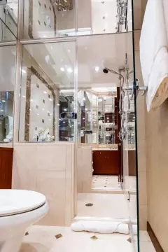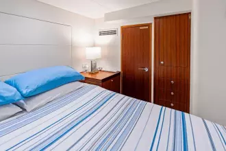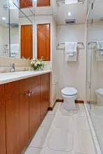 Making your way back to the salon we proceed forward to the starboard side and, before descending to the staterooms below deck, we come upon the day head, which is nicely appointed with satin wood cabinets, a granite counter top and mosaic tile covered walls. Upon reaching the bottom of the stairs we make our way aft to the full beam master stateroom. The room is a work of symmetry. The king bed is center with identical night stands, twelve drawer dressers, triple port lights and large closets positioned on each side. There is an en suite on each side joined together in between with a glass enclosed shared shower. The entry door is off centered to starboard as a large flat screen TV is off to port. All the way forward in the companionway is the VIP stateroom with a raised bed on center, storage cabinets each side and matching hanging closets. The spacious en suite has a glass-enclosed shower. The guest stateroom to port has a queen bed with overhead cabinets, two nightstands, dresser drawers for storage and a hanging closet. This stateroom has a single hull port light. The en suite is spacious as well. Across the companionway is the twin guest stateroom with a storage cabinet and dresser drawers. This room is en suite as well with ample space. There is storage below all the stateroom beds and a stacked washer and dryer in the companionway.