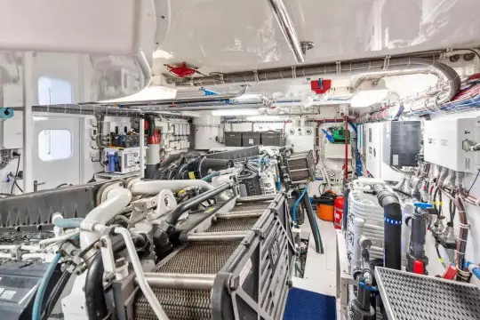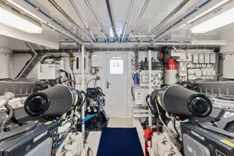 Entering the crew/engine room area aft, either by the pantograph door off the swim platform or the stairwell access from the aft deck, you’ll find two crew rooms aft, one with a full size bed for the captain and another with twins for the crew. There is a shared enclosed head/shower. In the corridor aft is a stacked washer/dryer and forward is access to the engine room. The engine room is a display, first of the quality of the rigging by Hatteras and second of the care the captain has given it over the years. It’s quite impressive and must be seen to be appreciated.