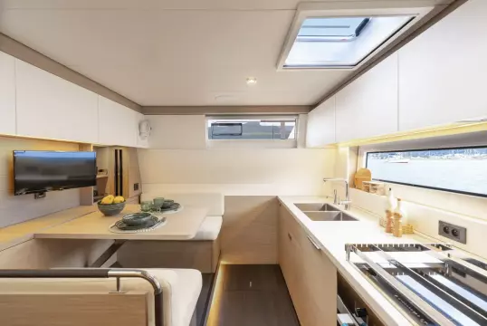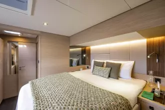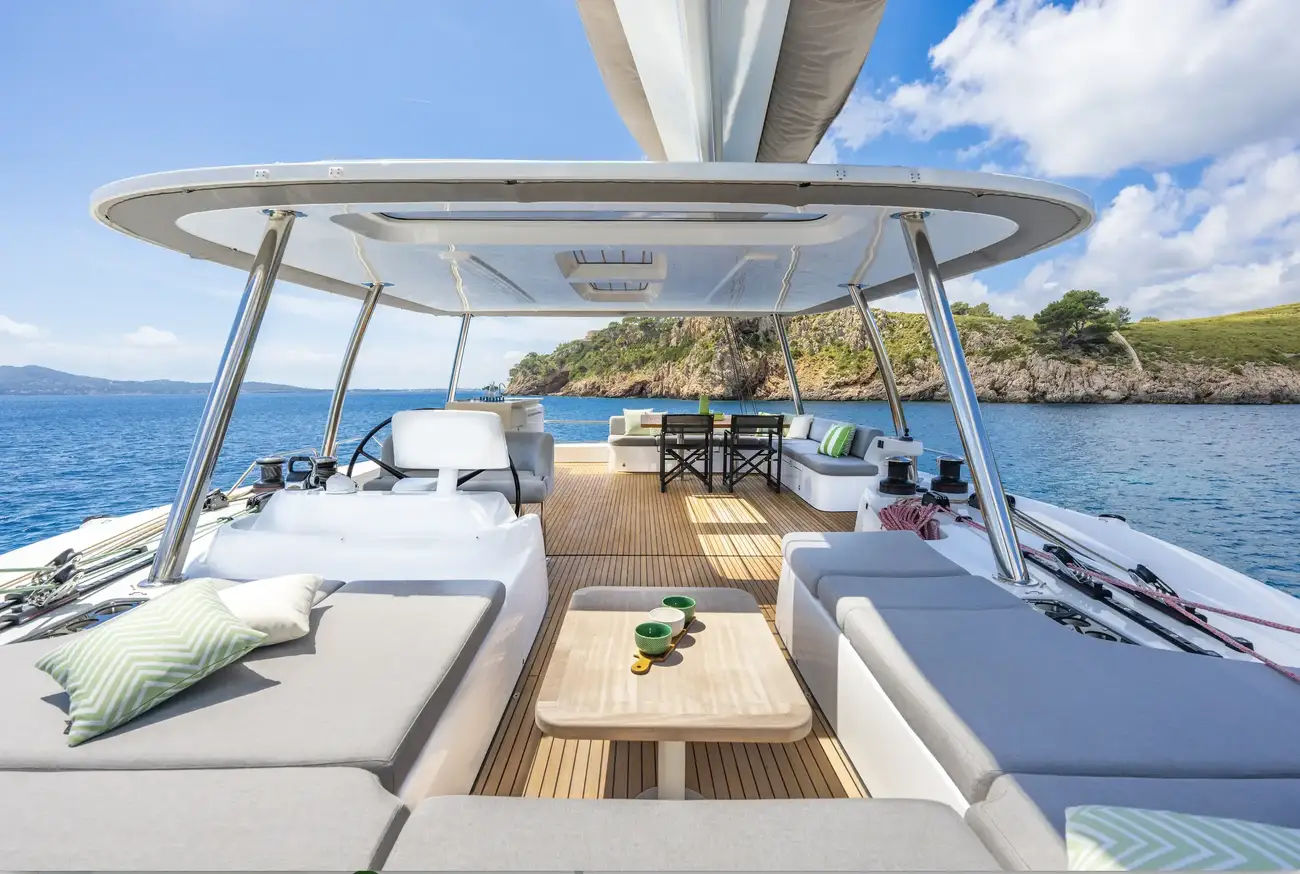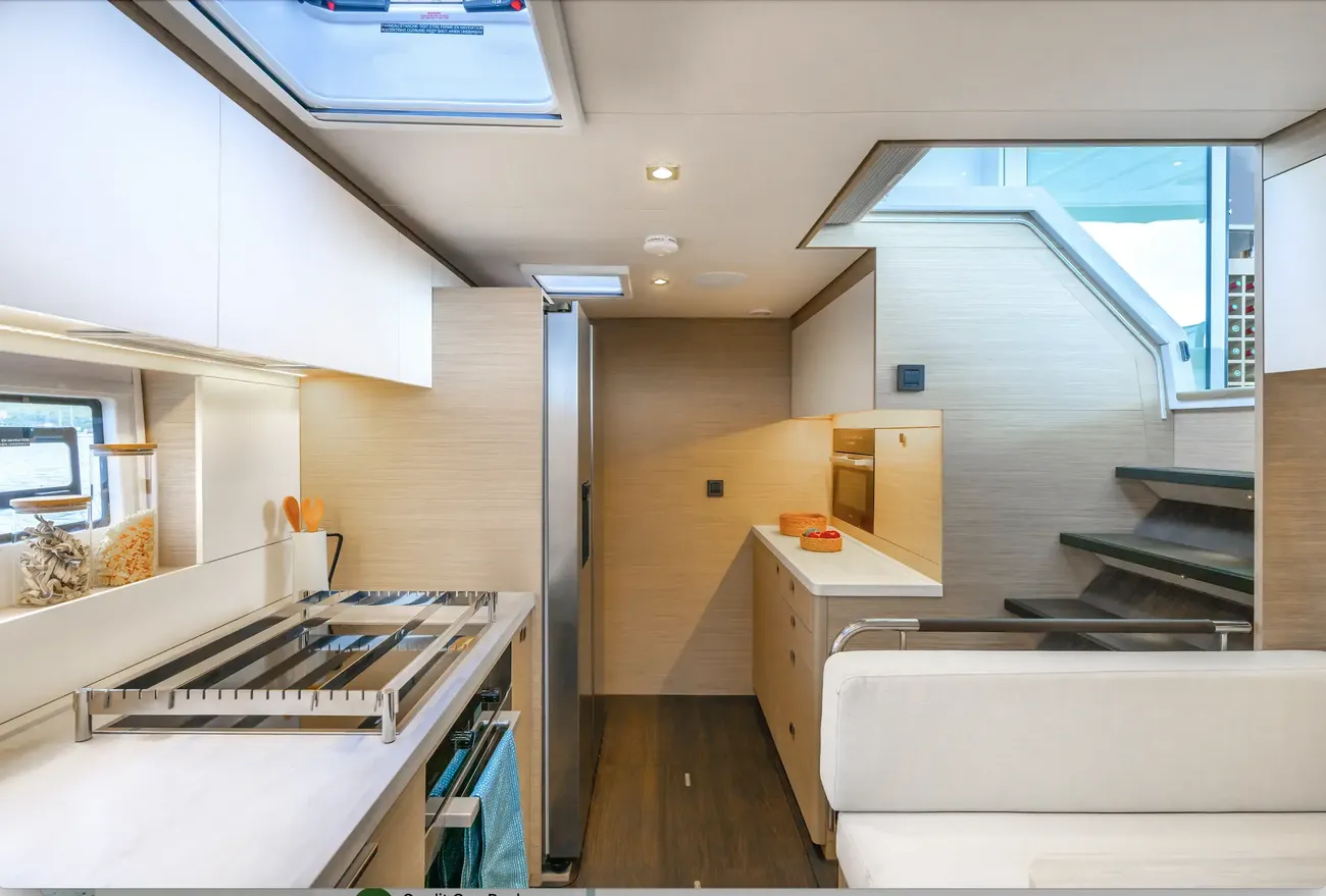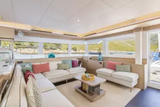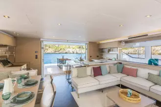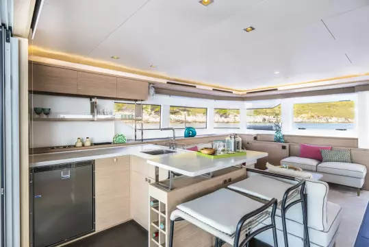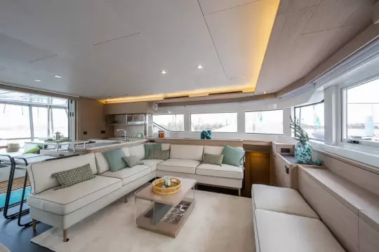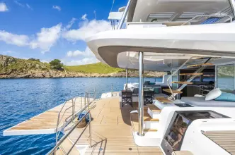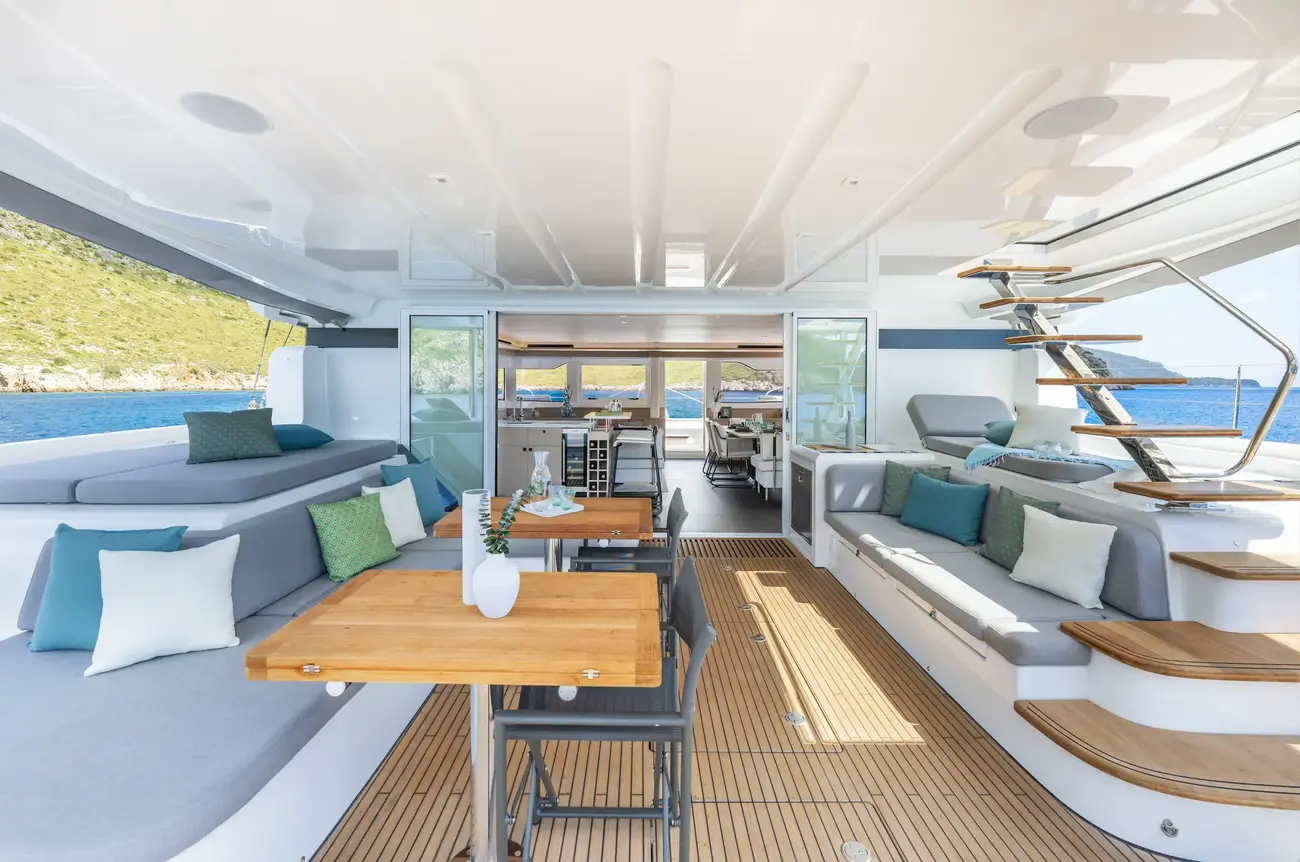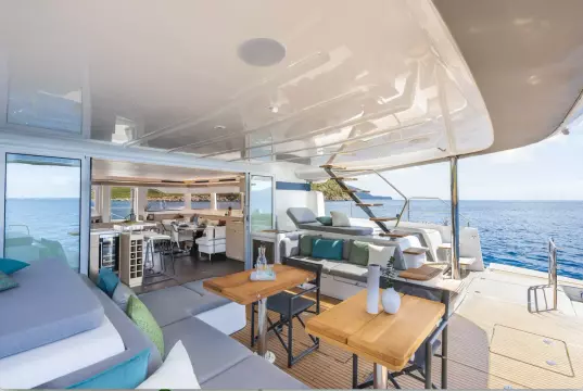 Accessed by a door forward of the saloon and with flush flooring, the vast forward cockpit offers a comfortable, inviting space for relaxation. Upon entering each living space, you are greeted with a panoramic view. Movement in the catamaran is fluid, without obstacles.