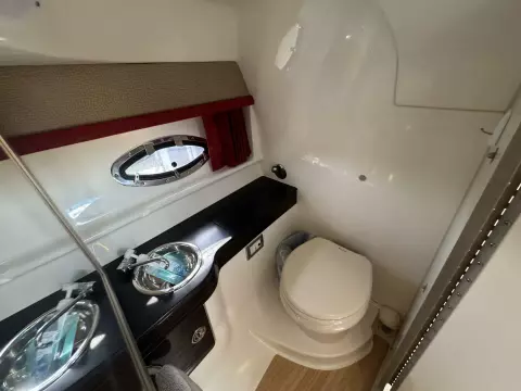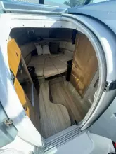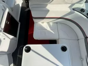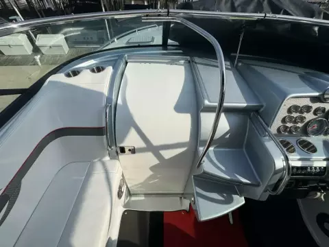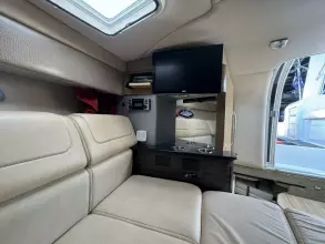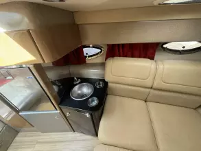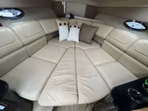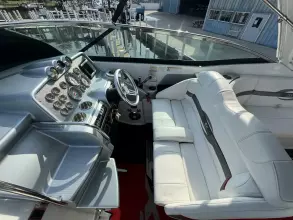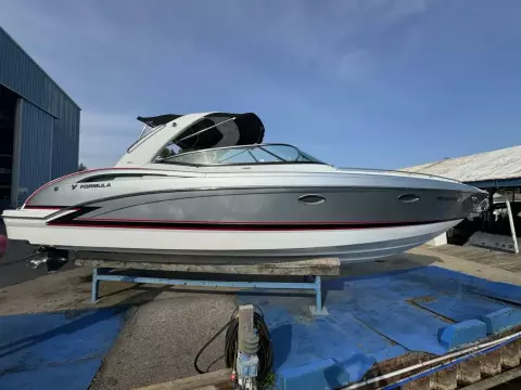 POWERBOAT GUIDE DESCRIPTION: There are many who view Formula as the gold standard in the building of sport boats and runabouts. It isn’t styling that sets Formulas apart, it’s quality—only a few production builders can match Formula’s superb finish and obsessive attention to detail. Introduced in 2007, the 310 Sun Sport offers a compelling blend of comfort and versatility. She’s an excellent choice for day trips or overnighting, and her spacious cockpit has seating for ten including a clever aft-facing transom lounge that converts into sun pad. In the cabin there are deep cherry wood cabinets, solid wood tables, and a luxurious Ultra-leather lounge. The enclosed head features an electric flush system with stainless steel sink and a pull-out shower. Standard features include a Corian galley counter, molded wet bar with sink, 36-quart cooler and trash receptacle, Dino tilt steering wheel, transom shower, and an extended swim platform with pull-up cleats. The transom storage trunk is a plus, and a power hatch lifts entire aft cockpit for engine access. Note the lockable under-dash storage compartment and slick LED lighting for the swim platform. Twin MerCruiser 320hp I/Os deliver 40+ knots wide open.