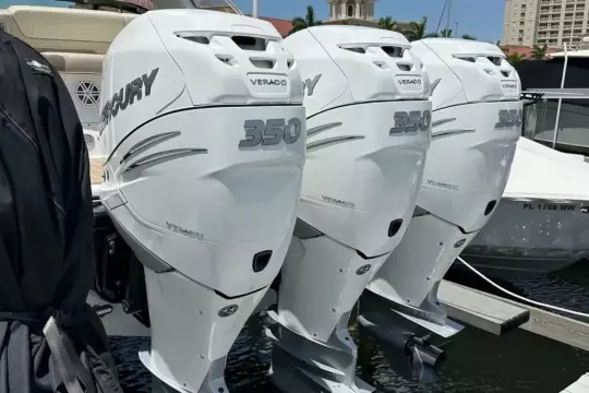 Triple Mercury Verado 350 JPO engines deliver a thrilling 1,050 horsepower, reaching cruising speeds of 36 mph and topping out at 58 mph — all enhanced by stainless steel 4-blade props for razor-sharp acceleration and responsiveness.
