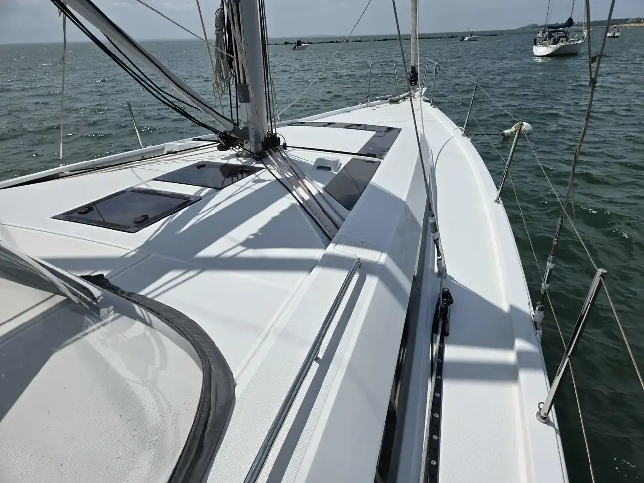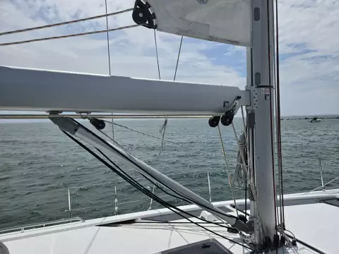 - Running rigging leads to helm area winches through clutch stoppers