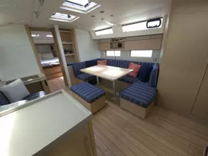Aft to port, there is a settee with a chart table forward. The settee can be lifted to create a comfortable lounge. To starboard, a U-shaped settee, a large dinette table, and a centerline bench with storage underneath provide seating for eight, perfect for dinner or card games. Two overhead hatches and deck and hull windows ensure plenty of light and ventilation.