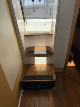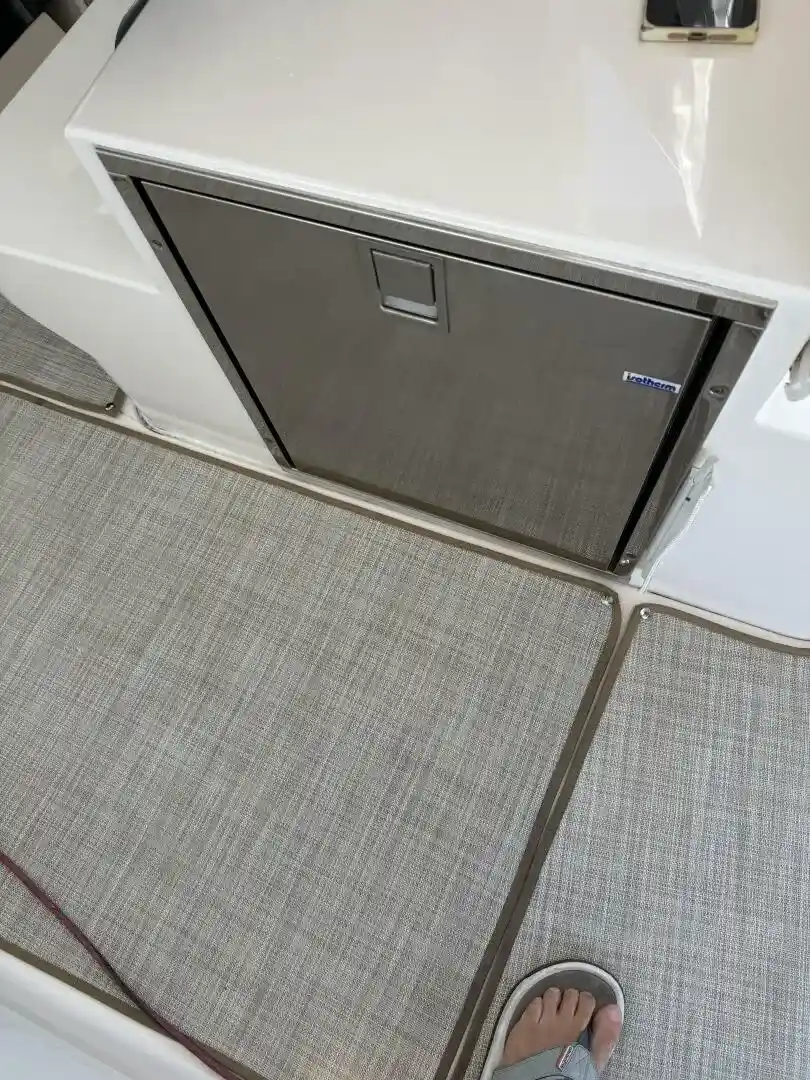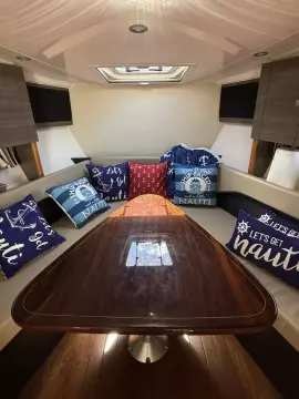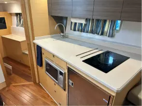 The air-conditioned cabin is bright and open, featuring a fully equipped galley, an enclosed head with separate shower, and high-end cabinetry and finishes throughout. The layout feels surprisingly roomy for a 36-footer thanks to clever design and generous headroom.