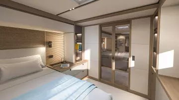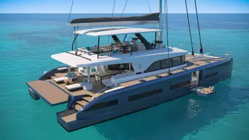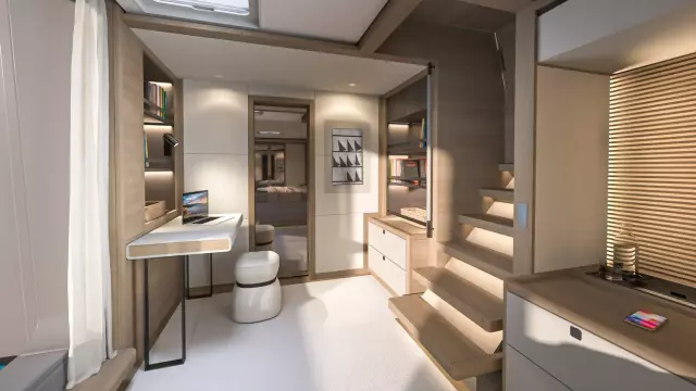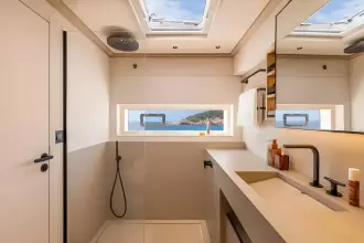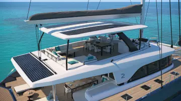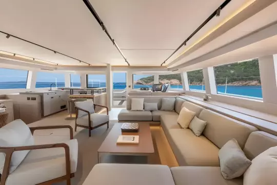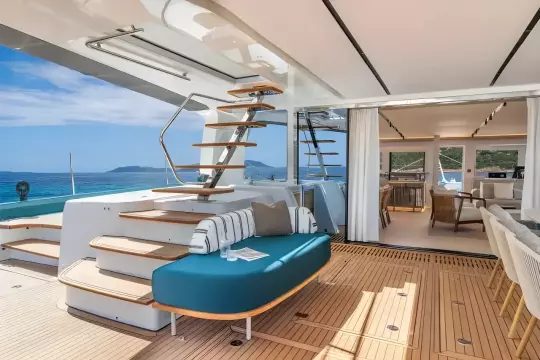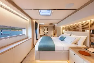 On the interior, the saloon with flush floorboards facilitates movement about the catamaran. Living spaces have been designed to experience life on board naturally, in complete freedom. Turned toward the exterior, the EIGHTY 2 features the design codes of seaside villas, offering a 360° view to admire the horizon.