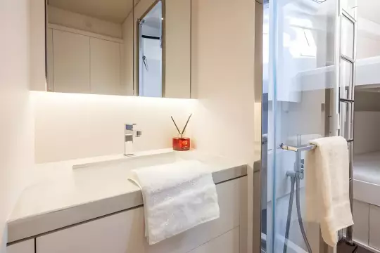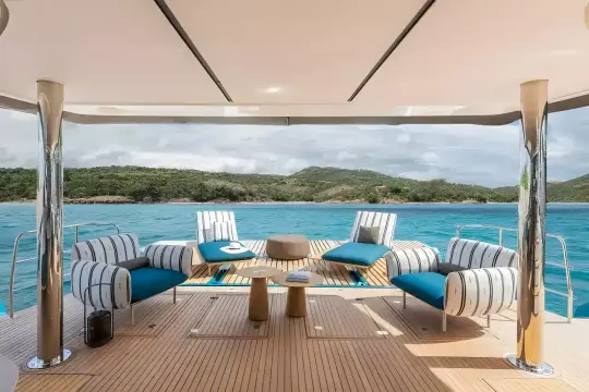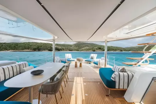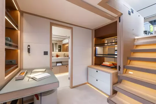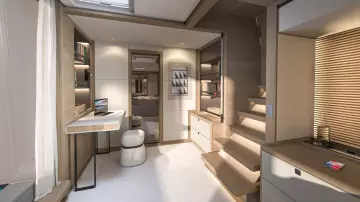 Aft, the swim platform can reach up to 22 m² when deployed, an extension of the cockpit. Adaptable to suit your preferences and cruising plans, it has been designed to integrate a tender or jet ski, as well as serve as a setting for the most beautiful dives.
