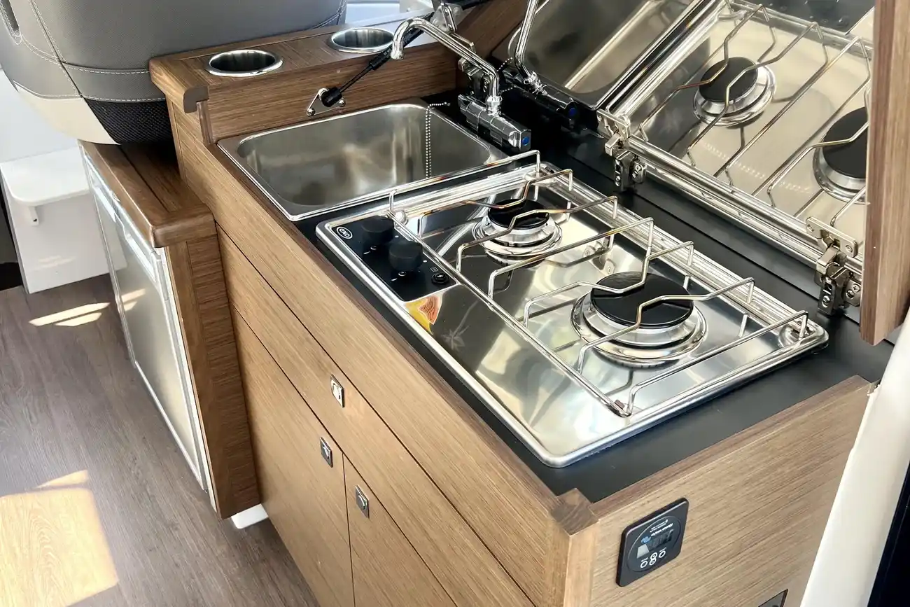 Designed for cruising, the NC 895 is a true weekender. She offers an incomparably bright interior, with wide windows in the helm station and even more comfort for those special shared moments on board. The cockpit features an L-shaped saloon, reclining setbacks and armrests with cup holders. Both on the interior and on the exterior, the setbacks pivot to adjust the seating to suit individual preferences.