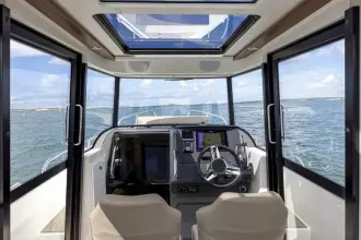 The foredeck of the C8 offers a multi-functional space with seating that can be transformed into lounge, chill or drive mode depending on the situation. The light and spacious cockpit offers plenty of natural light thanks to its extra-large glass doors, the sliding glass roof hatch and the openable aft deck hatch. The boat can easily be transformed from closed to open within seconds. In addition to creating a light and open boat, the large aft glass hatch makes loading and unloading the boat easy and efficient plus it makes communication between the crew outside and inside smoother.
