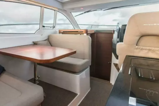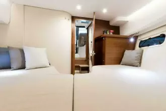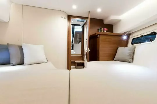 The helm has been maximized to provide the greatest possible customization and can be equipped with accessories according to individual requirements. Glued windows with a large, curved windscreen provide a great panoramic view. The salon features large flat surfaces and is both light, airy and cozy, thanks to the choice of materials and LED-lighting. The large glass roof and roof hatches provide a flood of natural light in the salon. A dinette provides plenty of room for four people to share a meal, but also converts easily into a double berth. The dining table can also fold down into a cocktail table with glass holders, making the salon a perfect place for socializing. The galley is well-equipped with ceramic gas heated glass hob with integrated ventilation, Corian top, 65-liter refrigerator and extra refrigerator/freezer box below the sofa on option.