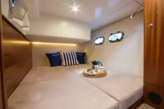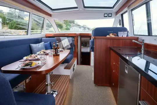 The boat has many similarities to her smaller sisters but offers several new features. The Nimbus Design Team has added several interesting aesthetic and functionally integrated details. These include twin touch screens at the helm, room for five to ride facing forward, a new D-pillar with integrated ventilation, fully glazed aft deck door, electric powered table on the aft deck and a “granny hatch” that conceals a main power plug on the stern. Other innovations include newly designed engine room ventilation in the hull sides with powered extractors, galley with ceramic gas hob and dark composite worktop, 120-liter capacity fridge plus extra cool storage in pull-out drawers beneath the salon sofa and much more.