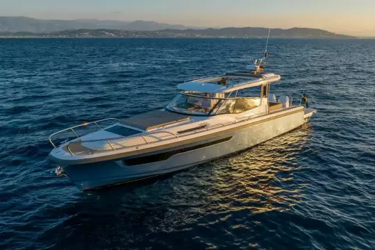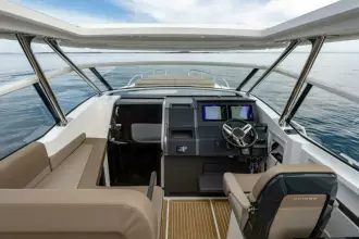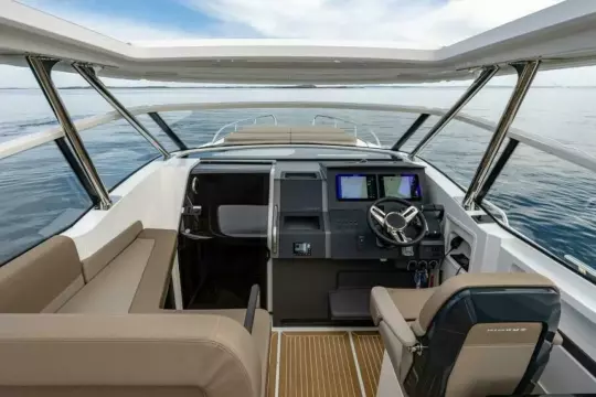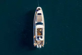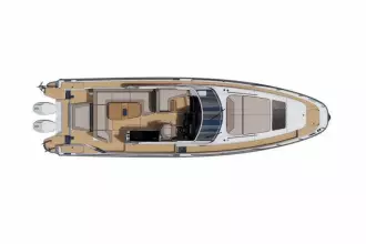 The standard open boat is equipped with a targa, but an optional large electric sun-top similar to that of the T11 can also be added. Below deck there is space for four people to stay comfortably overnight in two spacious berths and a spacious bathroom with toilet and shower.