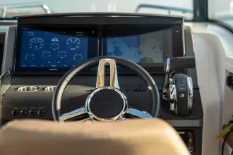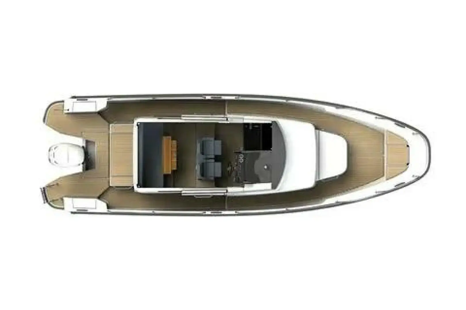 In place of the glass roof (fitted as standard), the boat can be equipped with an electronically opening canvas canopy, ideal for those wishing to optimize the open-air feeling on warm summer days. The driver’s position has space for two people and can be equipped with single 9″, 12″, or twin 12″ chart plotters. The foredeck features a large loading hatch with access to the cabin as well as an optional daybed which creates an extra seating area that seats 4 people with either a table or extended sunbed. The aft deck houses a wide sofa with ample stowage.