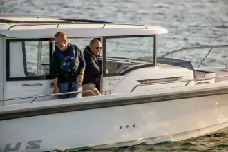 The Nimbus C9 is a boat for connoisseurs of contemporary Scandinavian design; those who appreciate well-thought-out solutions and smart functionality. The spacious cockpit offers splendid natural light, with a large, sliding glass roof hatch and a modern, snug helm position. The swiveling cockpit chairs provide ample space for four people to dine or space for five people in total. The cockpit passenger sofa converts easily into an extra bed for two children or one adult. The forward cabin has room for a double berth with separate head and kitchenette.