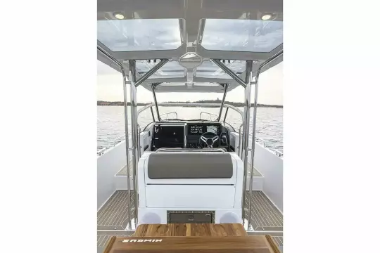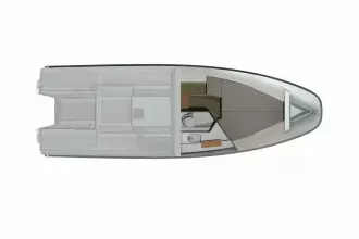 The T9 is equipped with single or twin Mercury outboard engines. The aft deck u-sofa with seating for 5 easily converts to a sunbed. There is an option for a wet bar with a hand basin and portable Weber LPG grill behind the helm seat. The module also functions as support while on the water or in port. The boat is available with three different canopy solutions – harbor cover, spray hood, or as a T-top design. The helm can be equipped with single 9″, 12″, 16″, or twin 12″ chart plotters. The foredeck features a large loading hatch with access to the cabin as well as an optional daybed which creates an extra seating area that seats 4 people with a table or extended sunbed. One smart way to make the most of the aft deck area is spare railing cushions that can be placed on the railing, offering both extra seating and a cozier atmosphere. Below deck is a large berth for two with integrated ventilation, ample stowage and separate head with sink.
