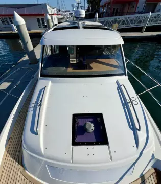 The 365 has laminated windows with a large arched front windshield, a new flush-fitting sliding door to starboard and a fully openable window to port.