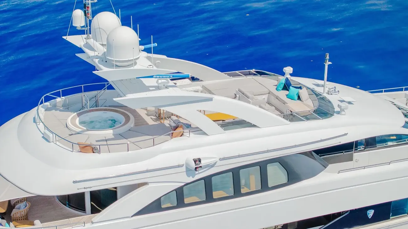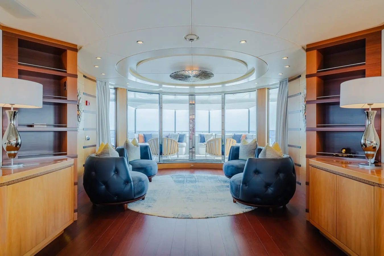 The main salon and dining area flow seamlessly into a circular aft lounge with panoramic views and direct access to the aft deck—perfect for indoor-outdoor living. The expansive sundeck includes a Jacuzzi, a large lounging area, and an entertainment bar equipped with a remarkable sound system and full galley amenities, including a dumbwaiter to the galley deck for discreet service.