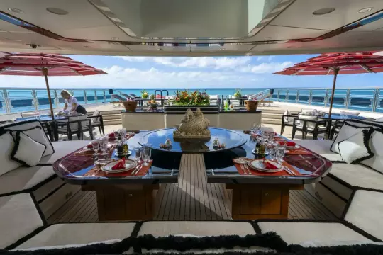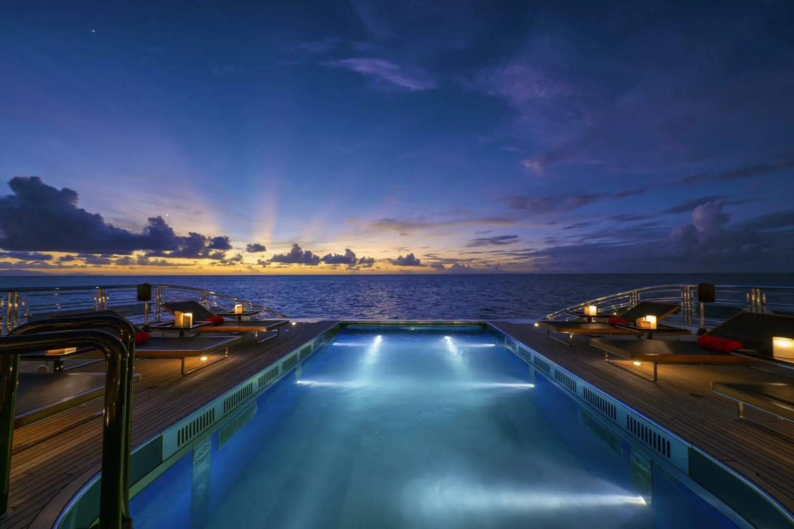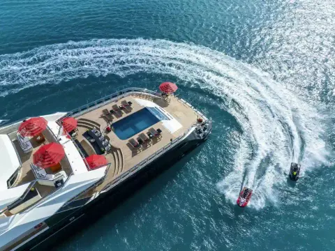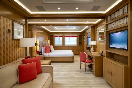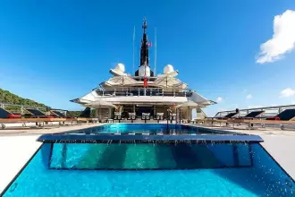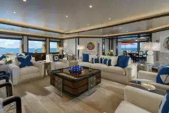 Gym with Lifecycle, Nautilus omnigym, Treadmaster, Power Plate, Tempus diagnostic system linked to medical centre, spa and beauty salon with new sauna, Piano, theatre-lounge, dance floor, new fresh water shower on stern swim platform, elevator, Comprehensive audio-visual systems, iPad controls, satellite television. Satcom & cellular communications facilities, VSAT, Fleet 77, WiFi internet access, swimming pool, Stabilizers.