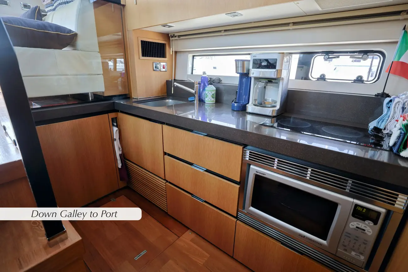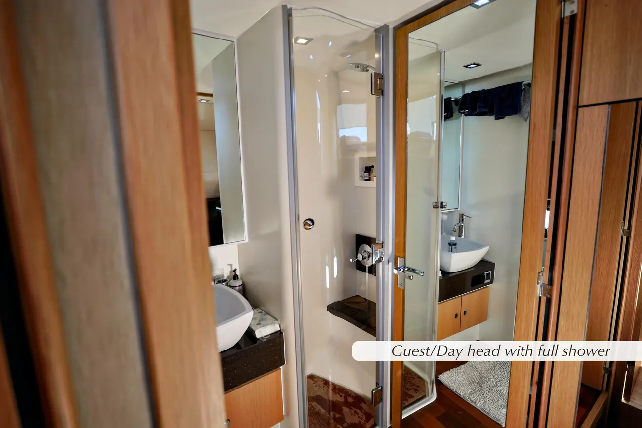 - Two staterooms and two full heads providing refined accommodations finished in Fairline’s signature joinery and top-shelf materials.