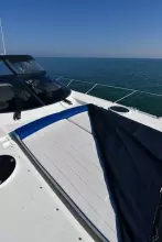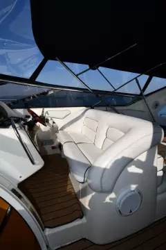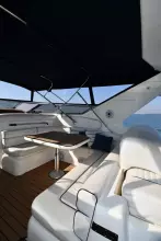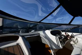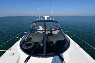 A popular model, the Camargue 55 helped define the Sunseeker reputation in this country for aggressive styling, luxurious accommodations, and exciting open-water performance. The Camargue was an impressive yacht when she came out in 1994 with deck and cabin accommodations that could only be described as opulent. The spacious cockpit, which consumes about half of the boat’s length, provides seating for three at the helm along with a mid-cockpit dinette and a huge aft sun lounge. Beneath the sun lounge is a garage for a tender or jet bike with an electric winch for launch and recovery. Below deck, the Camargue’s three- stateroom interior was updated in 1995 when a curved galley and dinette replaced the original U-shaped galley and dinette. In both configurations, the blend of high-gloss cherry woodwork, expensive galley appliances, and plush furnishings can only be described as lush. Additional features include a teak cockpit sole, bow storage locker, radar arch, and a hot/cold transom shower. Among several diesel options, twin 760hp 8V92 Detroits cruise the 55 Camargue in the high 20s and reach 30+ knots top.