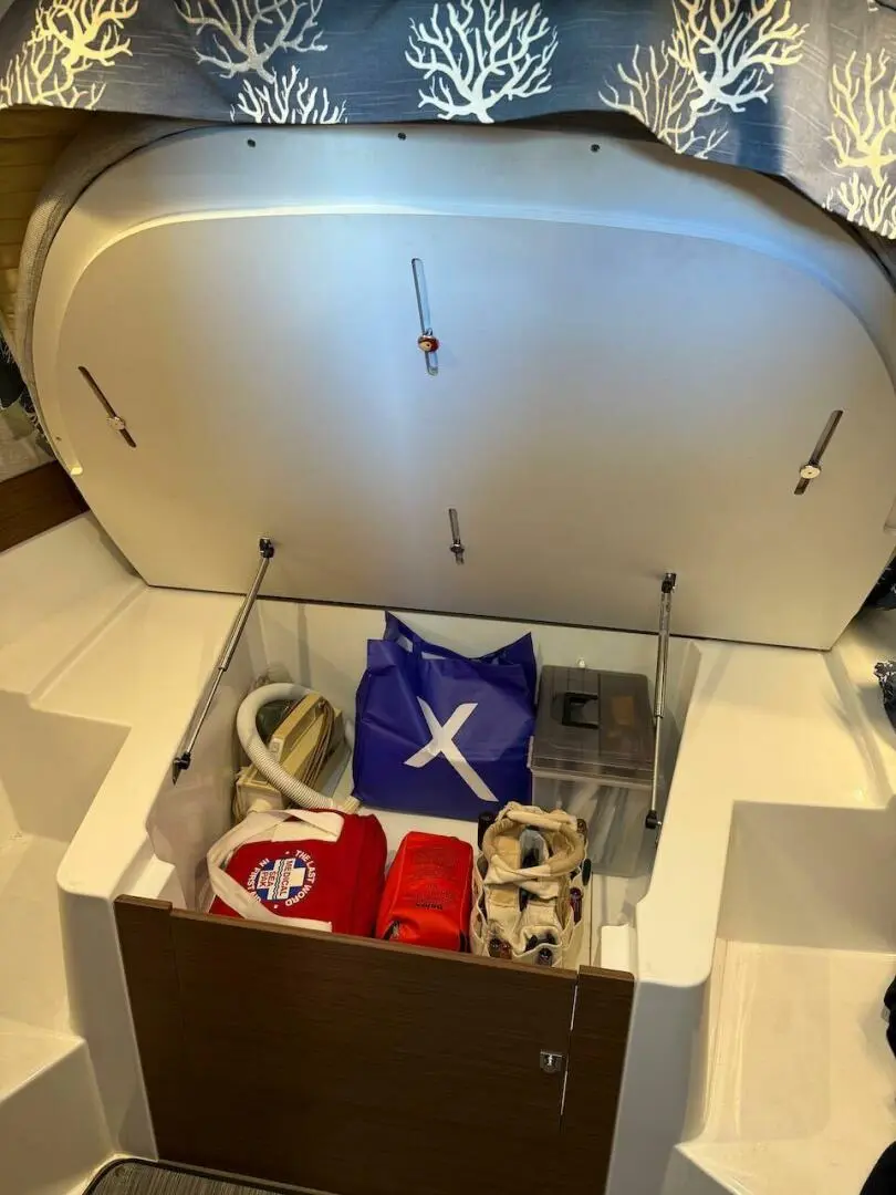 - Forward owners cabin with central island bed with hanging locker & large storage space under the berth