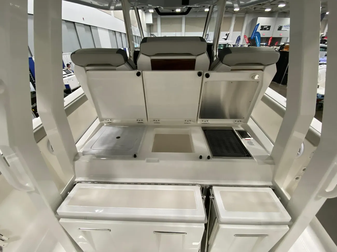 - Cockpit Entertainment Center: Sink with Removable Cutting Board & Fold-Down Faucet, Insulated Cooler Box, 120V Grill, 120V GFI Protected Outlet, Hinged Fiberglass Lids, 12V (2.3ft3) Pull-Out Style Stainless Steel Refrigerator, Slide-Out Trash Receptacle, and Bottle Opener