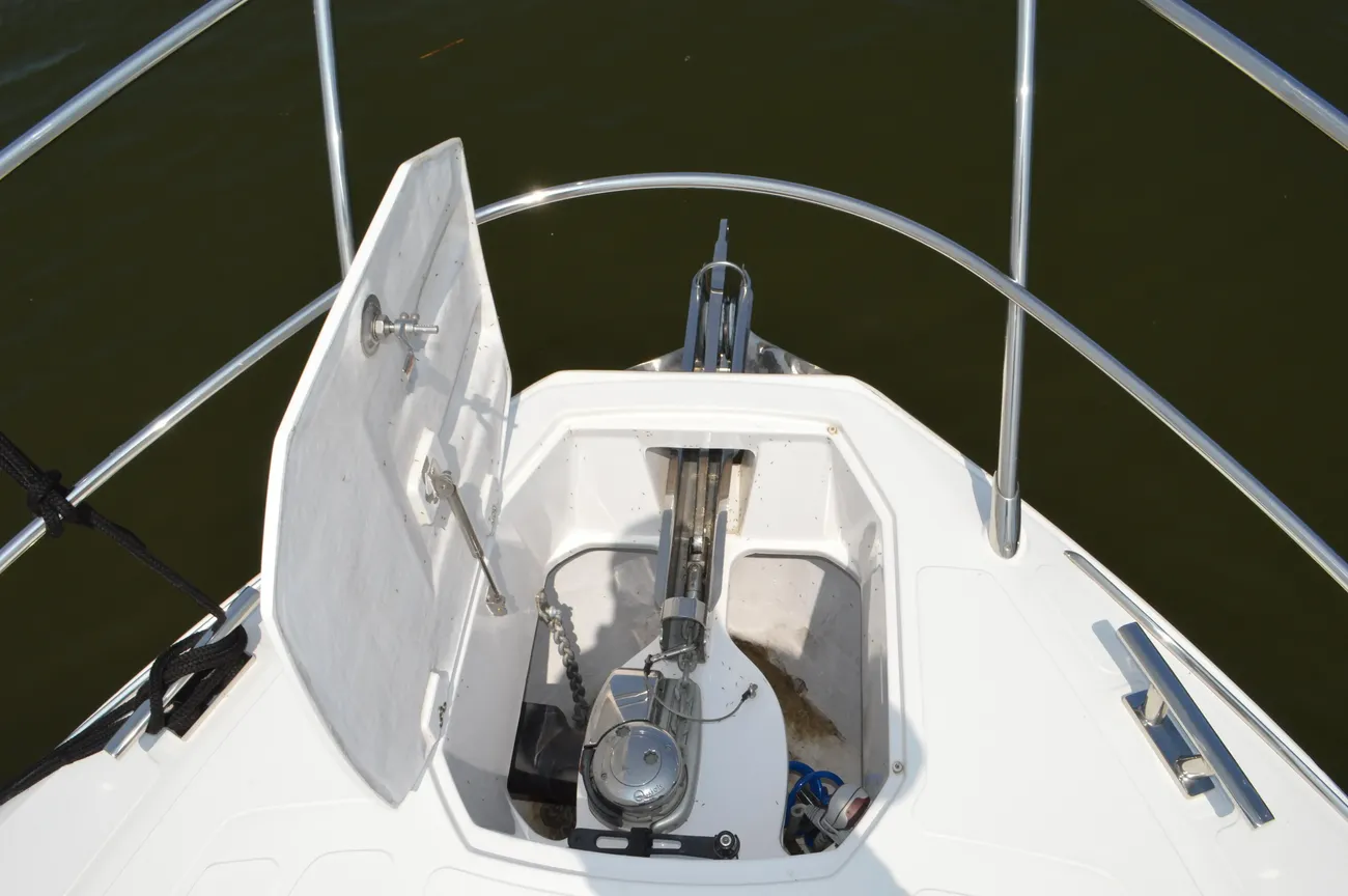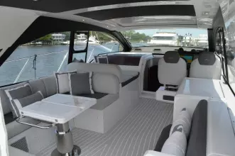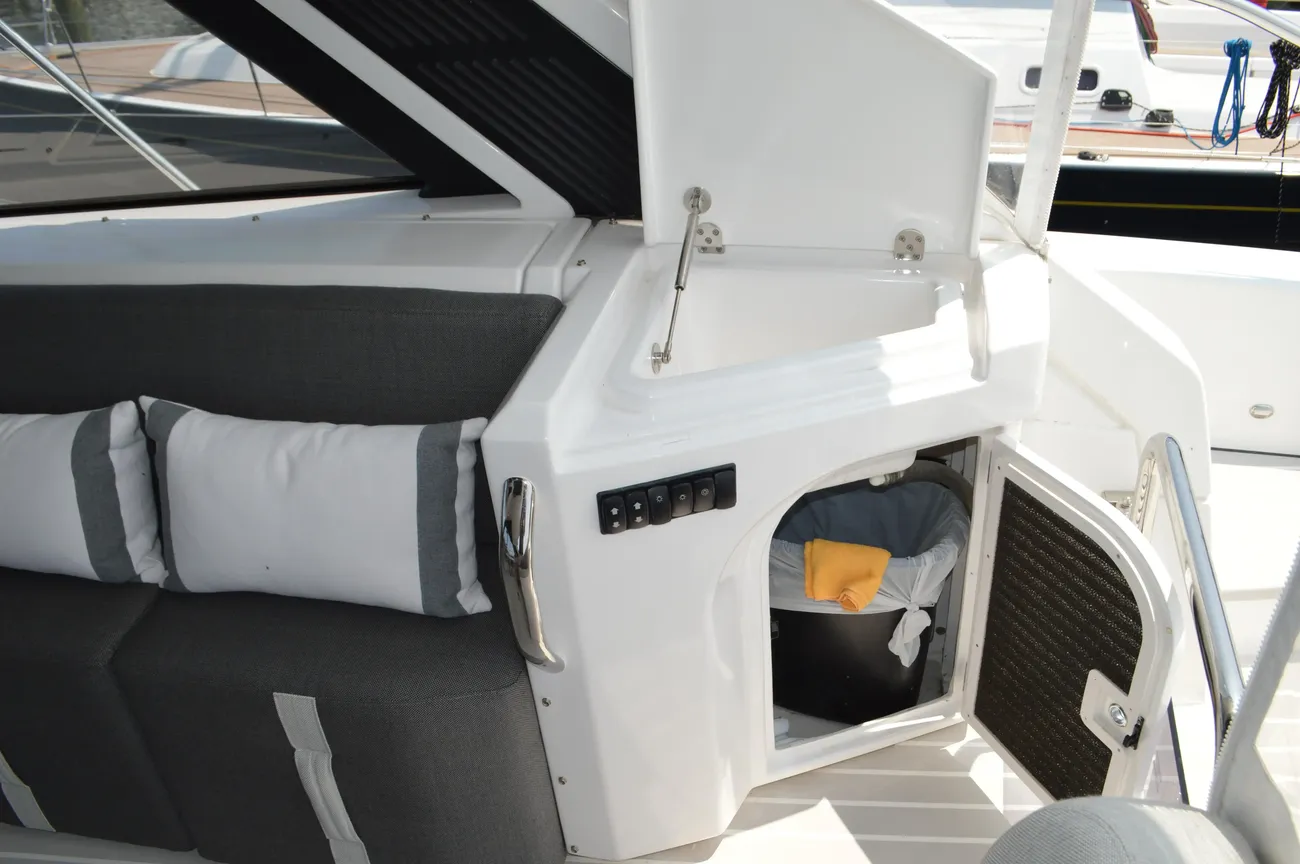 The Salon features a blend of modern Grey oak finish woodwork and dark charcoal painted overhead cabinetry. The interior is bright and feels very spacious. The forward Master layout allows for a fantastic overall configuration that includes 3 generous staterooms and 2 heads, along with a well-equipped galley and ample storage.