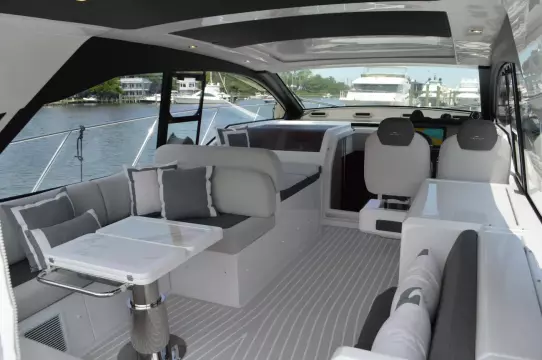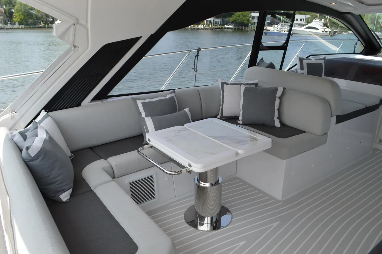 The cockpit lounge seamlessly integrates indoor and outdoor spaces. It offers flexibility for gatherings, with convertible, cushioned furniture that allows ample movement. The folding table and freestanding sofa can accommodate a full complement of guests for meals.
