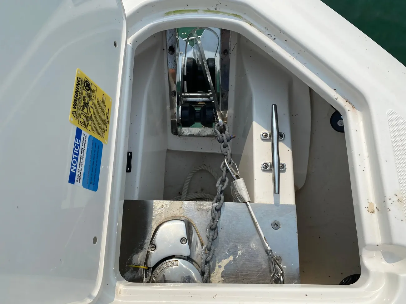 - Flush Mounted Integral Anchor Locker (self-draining) with Fiberglass Lid including: 316L Stainless Steel through Stem Anchor Roller with 8" Mooring Cleat, Chain Binder, 14lb Galvanized Plow Style Anchor, Self-Righting Shackle and 150' Rode (1/2" 8 Plait including 10' of ¼" G4 Chain)