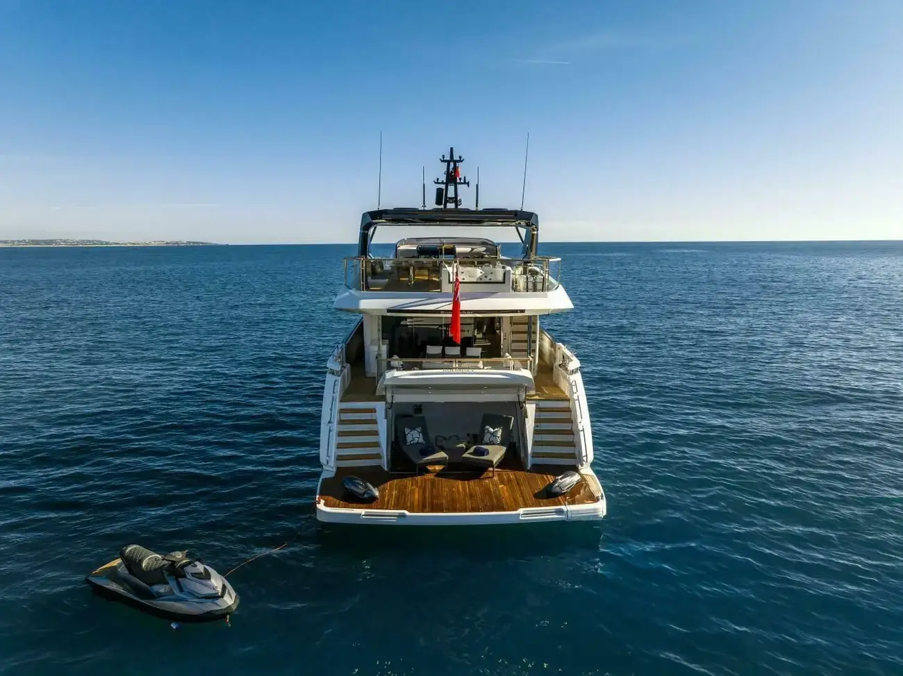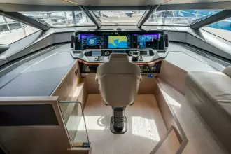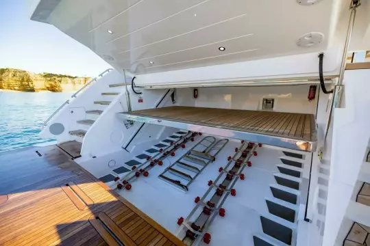The revolutionary Sunseeker ‘Beach Club’ provides an exceptional area to relax at water level. The tender garage can accommodate a Williams 460 Sportjet and GTX255 jet ski, with plentiful stowage for SeaBobs, diving equipment and paddleboards. The innovative X-TEND™ system offers several seating arrangements, facing aft in its lowered position or, at the flick of a switch, forward at cockpit level.