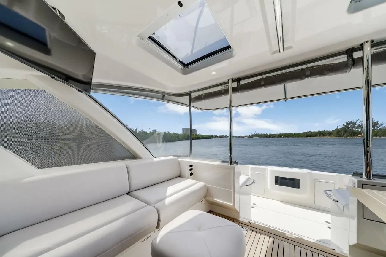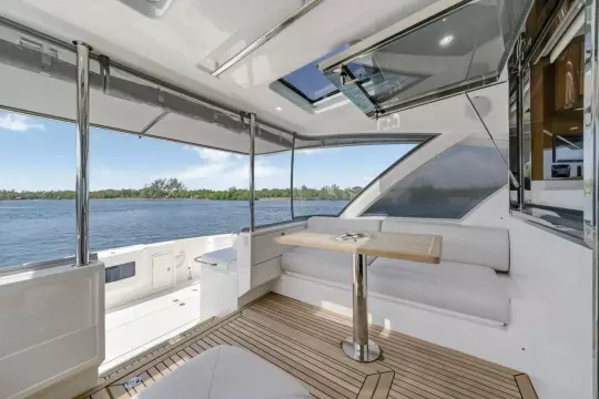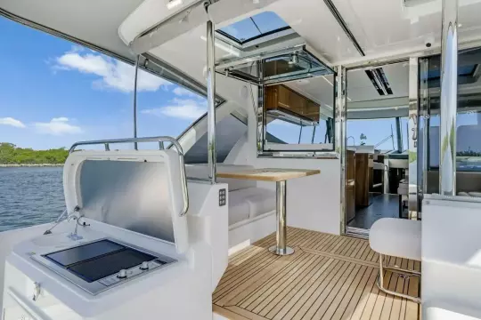 - Mezzanine - 32" TV mounted on the hardtop in stbd forward mezzanine on a stainless steel mount, connected to cockpit speaker system (Milestone 1)