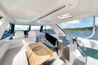 • Flybridge aft docking & fishing helm, Electric steering, S/S wheel inc. stop/start panel /dual lever engine controls, horn and dash cover