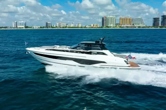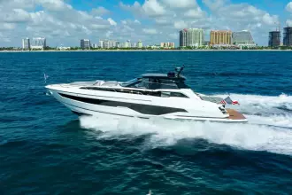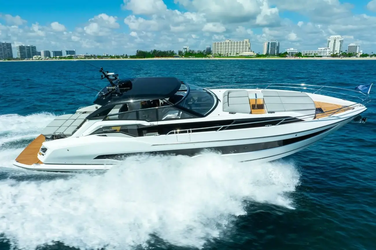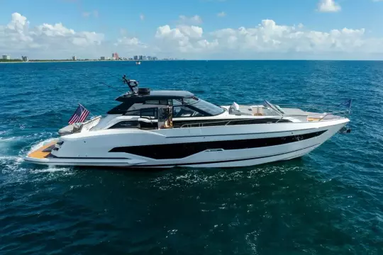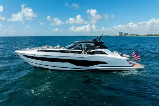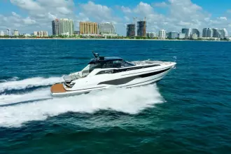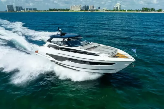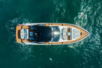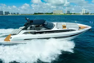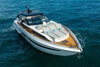 The Superhawk 55, powered by twin Volvo Penta IPS 950 engines, reaches a top speed of up to 38 knots. This iconic Sunseeker sports cruiser features contemporary proportions, luxurious outdoor social spaces, and generous interior accommodations, making it ideal for day cruising or weekend getaways.