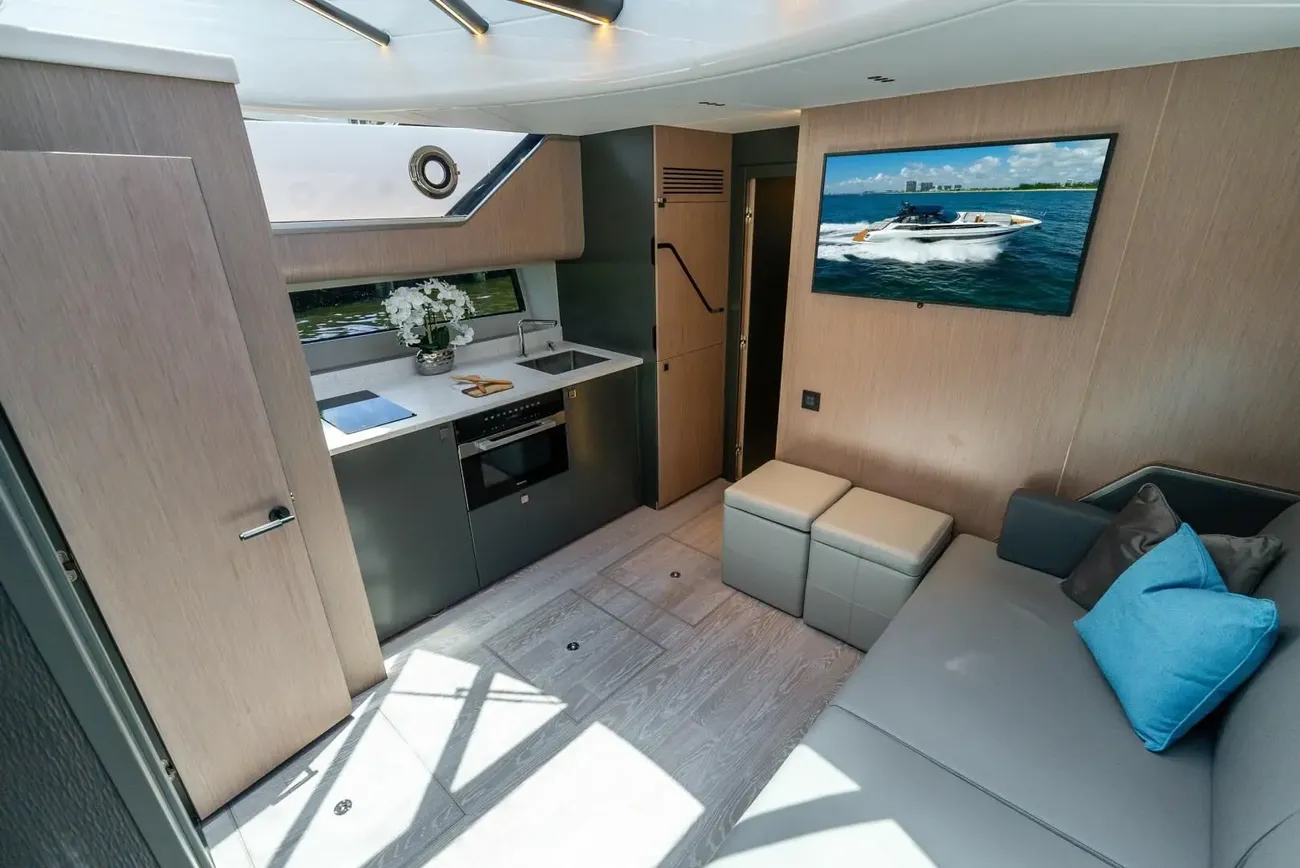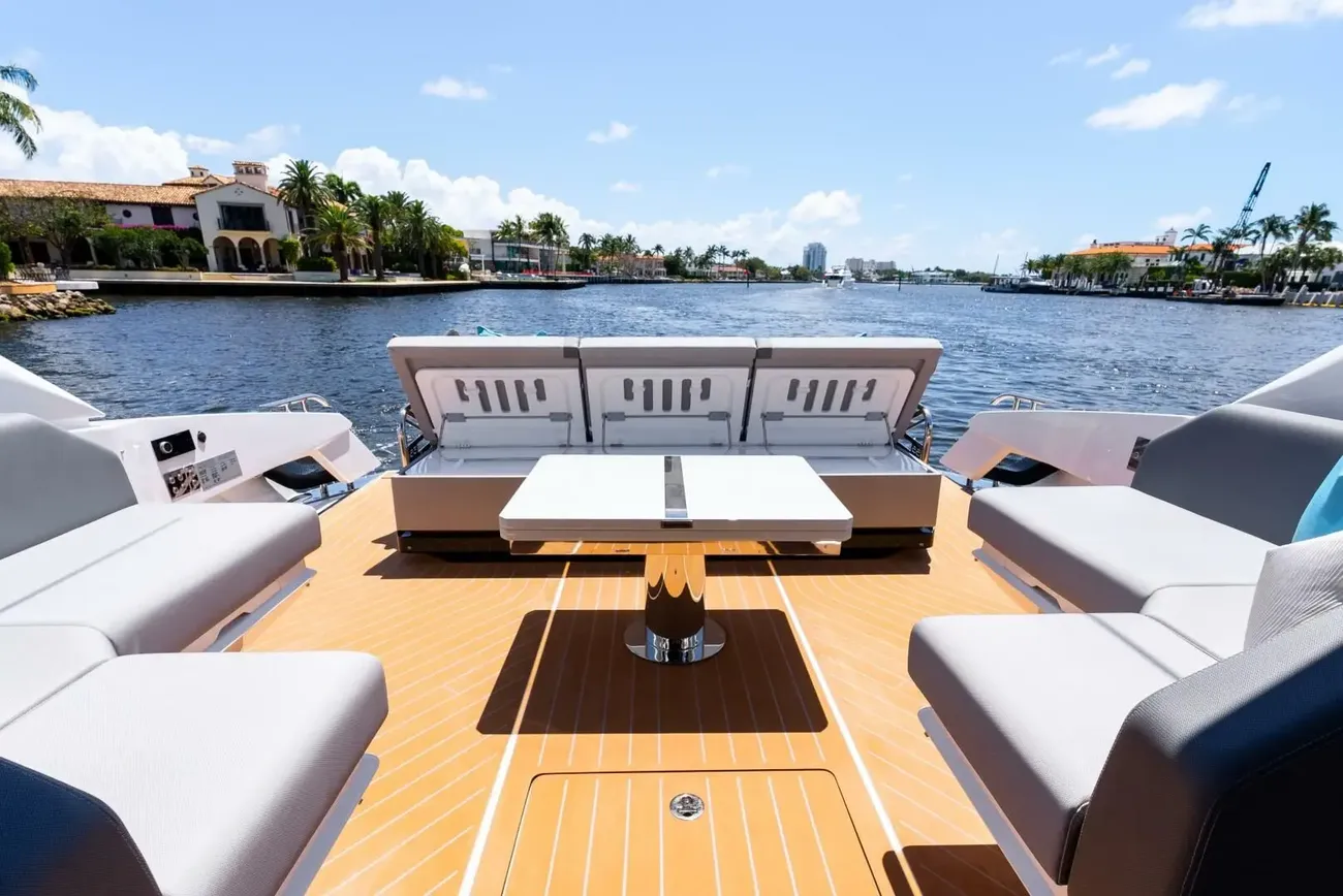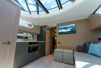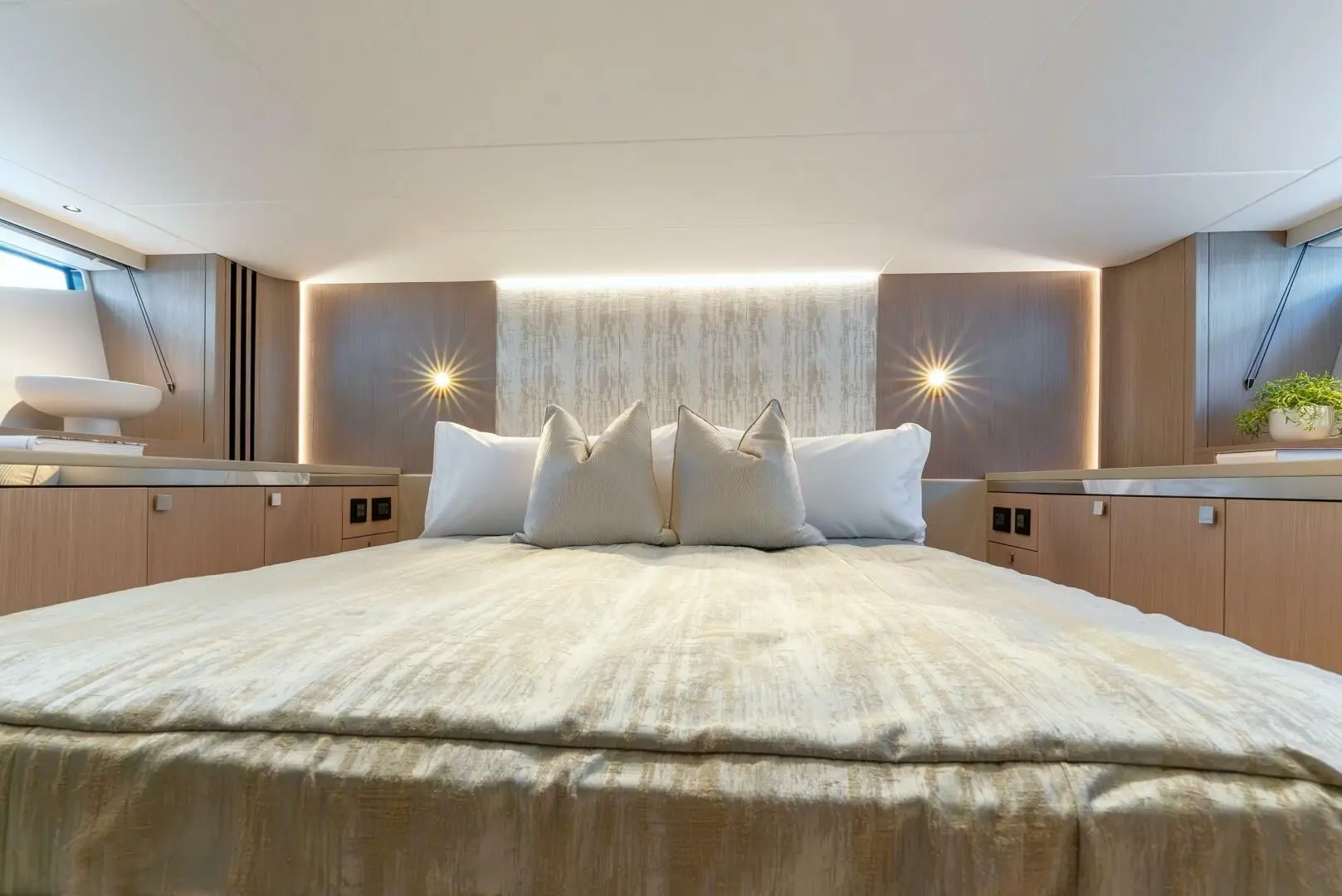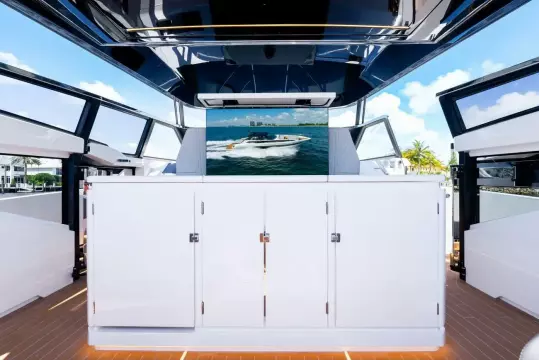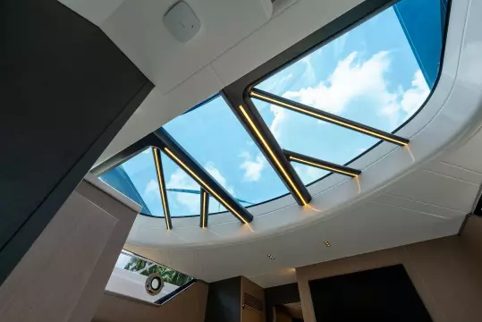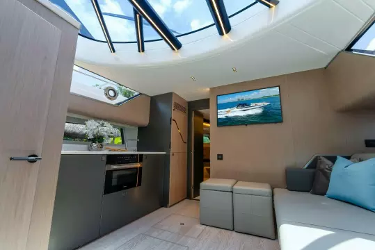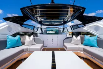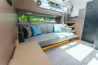 The eye-catching exterior is complemented by a lavish interior. The aft cockpit includes a central large wet bar and various furniture configurations to maximize the spacious deck. Steps lead down to a luxurious open plan lobby and galley area, illuminated by LED lighting. Additional recessed lighting, curved wood, and lacquer finishes enhance the premium feel. Natural light floods in from the expansive screen above, and electrically operated blinds provide intimacy and shade when needed. The forward VIP cabin features an en-suite, upholstered side units, and a wardrobe unit to port, along with a large bed. The interior offers different styling palettes for a customized feel. The aft Master cabin includes sliding berths that can be configured as either a double or two singles, along with a generous en-suite. Black lacquer panels frame this main cabin, creating an ambiance of pure indulgence.