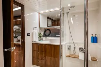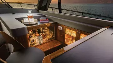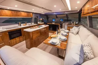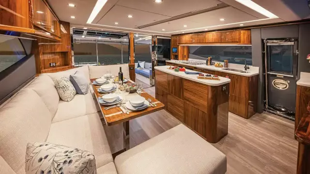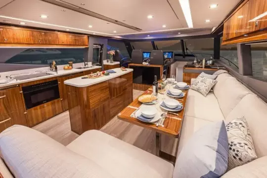 - Convert utility room to single berth crew cabin Saloon/Galley/Helm/Bar - Four Waterfall ends on Galley benches (no storage