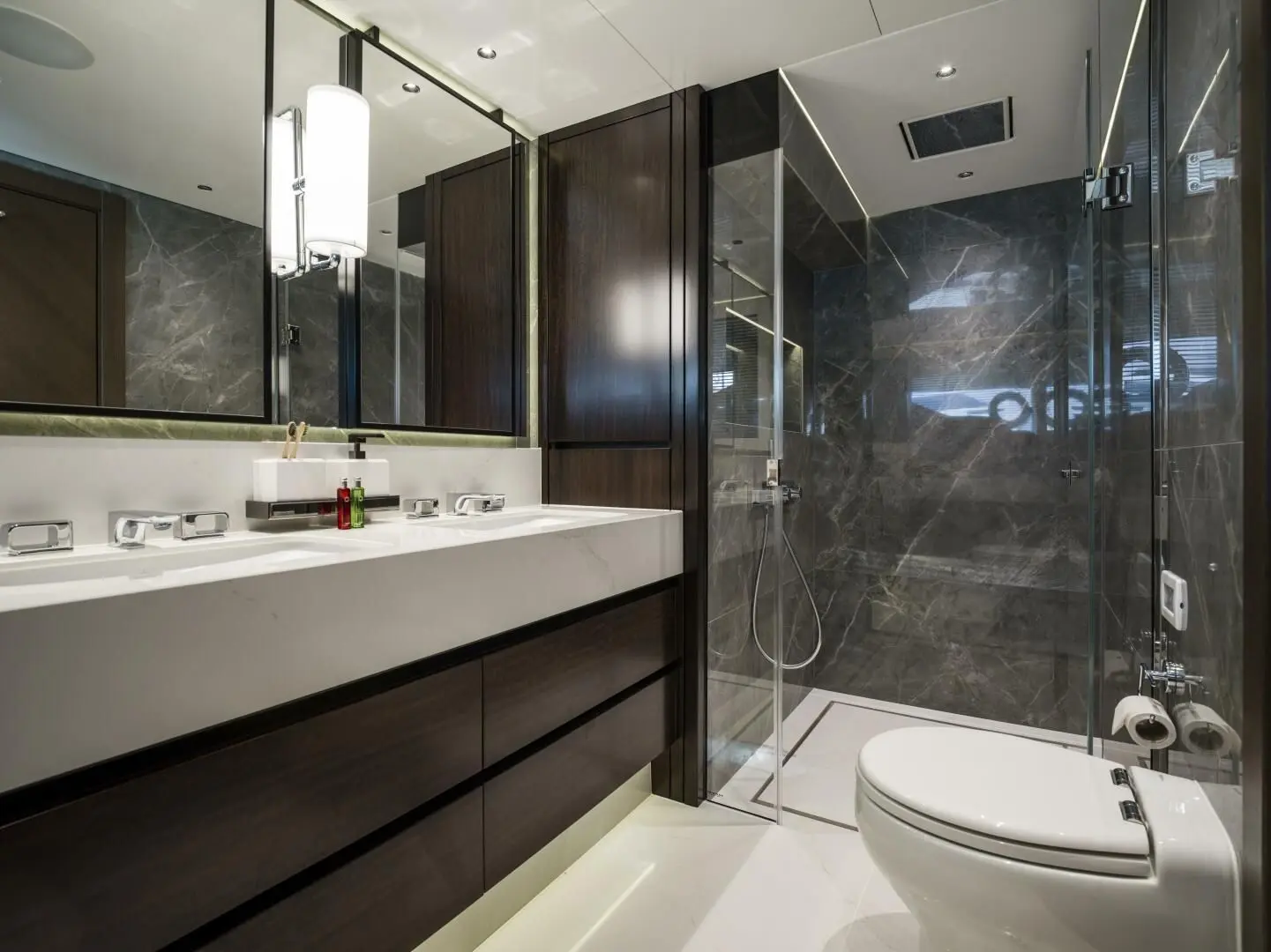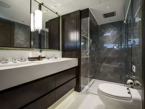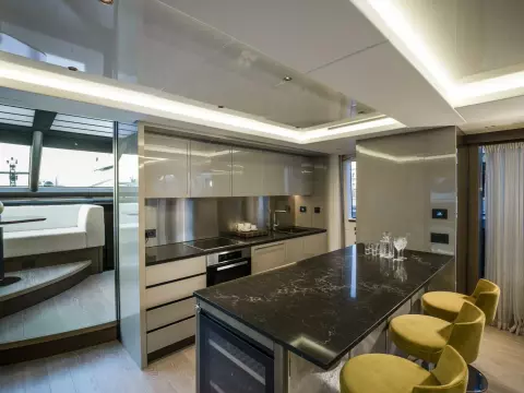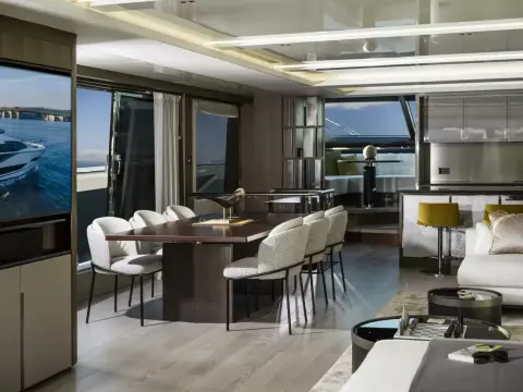 The adjacent hydraulic platform offers ample space for housing and launching a Jet Ski, a Williams 460 SportJet, and two SeaBobs, all stored in dedicated self-draining lockers. The flybridge is an impressive 25% larger than that of comparable luxury yachts, with options for an infinity spa pool and sideboard with a second integrated BBQ. A wet bar equipped with a stainless steel sink, drawer fridges, ice maker, and glass bar top enhances this popular entertainment area.