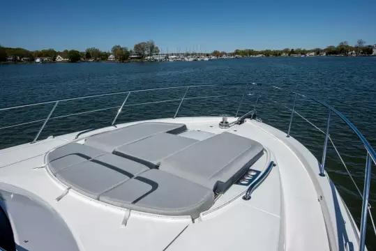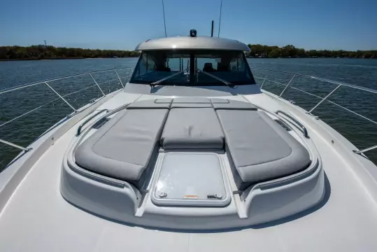 - Sun pad on fwd deck - Dove vinyl - closed cell foam - lift up backrest - white stamoid cover - drinks holders - stainless steel rails - 2x storage lockers