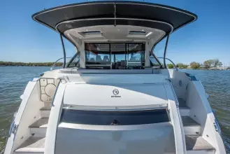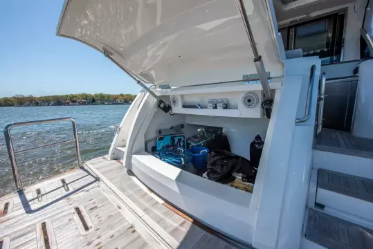 The swim platform is hydraulic with a lifting capability of 300 kilograms, sufficient to haul and retrieve a good-sized RIB tender. The boat also has a garage for storing water toys and equipment. The garage door opens to a large angle, creating shade and providing good headroom when walking around the platform. Speakers in the garage, along with a shelf and removable swim platform rails, help create a beach club feel on the swim platform, making it more than just an area to get on and off the boat.