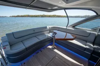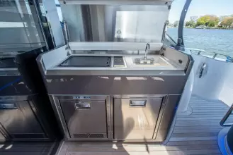 The cockpit features oversized L-shaped seating that wraps all the way forward to the sliding salon door. The sofa has a modern “floating” look with upholstered bolsters and underlit blue strip lights. A folding high-gloss teak and holly table has integrated stainless steel cupholders and grab handles. The garage is accessed from the seat bottom of the forward-facing cockpit bench, making it easier to retrieve fenders, lines, lifejackets, etc., without opening the garage door. Opposite the cockpit seating is a fully equipped wet bar with sink, grill, icemaker, and refrigerator. Color changing overhead lights, a cockpit sun awning, and sliding sunroofs complete a comfortable cockpit well-suited for entertaining.
