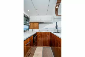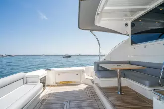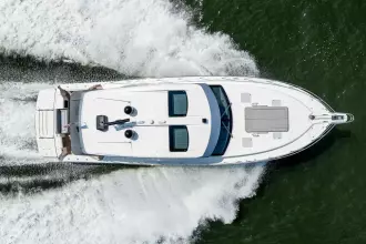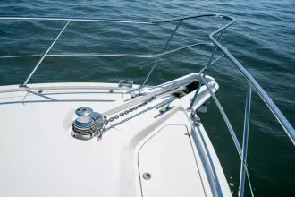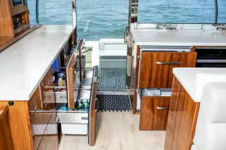 The bow is easily and safely accessed with wide walkways, handrails, and blue LED floor lights. A double-wide sunpad, bow sunshade, and cup holders make the bow a very comfortable place to relax either in or out of the sun. Four deck hatches give natural light and ventilation to the cabins below. There is plenty of foredeck forward of the sunpad for congregating, handling lines and fenders, or storage of bulky items.
