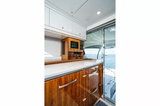 Starting at the stern, the swim platform has tender chalks and a fold out swim ladder. Rather than just sitting flush when in the up position, it also can come up several inches to bring the platform further away from the water when in rough seas. A tuna door and folding coaming makes entrance to the cockpit easy. The boat can be fished hard with a recirculating livewell, 14x rod holders, cockpit flood lights, wash down, and outriggers. But it is just as outfitted for entertaining with a forward-facing aft bench seat, L-shaped mezzanine seating, and wet bar featuring sink, double grill, refrigerator, and icemaker. A fixed awning keeps the sun off the mezzanine area and has a removeable extension that can cover the entire cockpit. For extended periods of storage and to protect the teak, the boat has a full cockpit cover from the fixed awning to the rub rail in all directions. For ease of docking, the starboard side cockpit houses a concealed docking station complete with joystick, ignitions, and switches).
